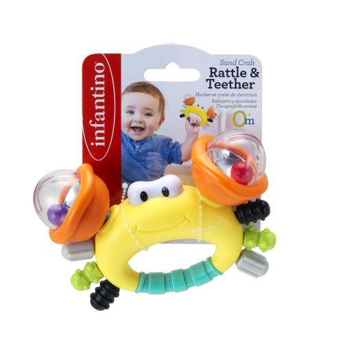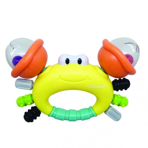 Пясъчен рак със забавни тракащи щипки. Текстурирани крачета за никнене на зъби. Отлична звукова и тактилна стимулация за растящи бебета. Сигурна дръжка за носене.