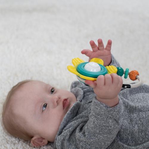 Тази весела дрънкалка предлага много занимания, които малчуганите могат да открият. Многотекстурираните венчелистчета са идеални за никнене на зъби и сензорно обучение. В центъра на ролковия елемент има подскачащи мъниста с цветовете на дъгата. А лесната за хващане дръжка включва въртящи се мъниста.