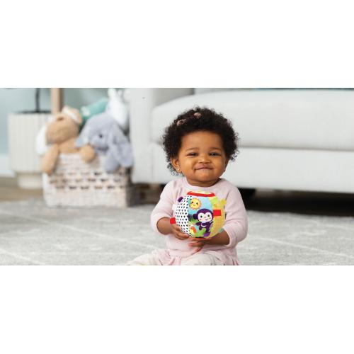 Сензорна топка със звуци и огледало, която може да помогне за развитието на двигателните умения и сетивата на детето, докато то се забавлява, изследвайки различните цветове и форми.