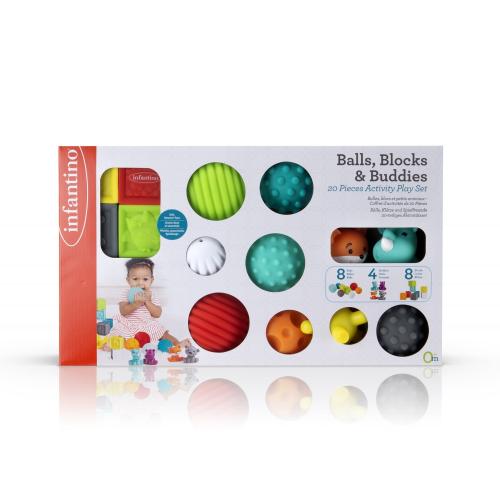 Комплектът се състои от 8 топки с различни размери, структури, цветове и форми, с които вашето бебе ще се забавлява много. Освен това има 8 кубчета, с животни отстрани, и 4 животни, с които да си играе.