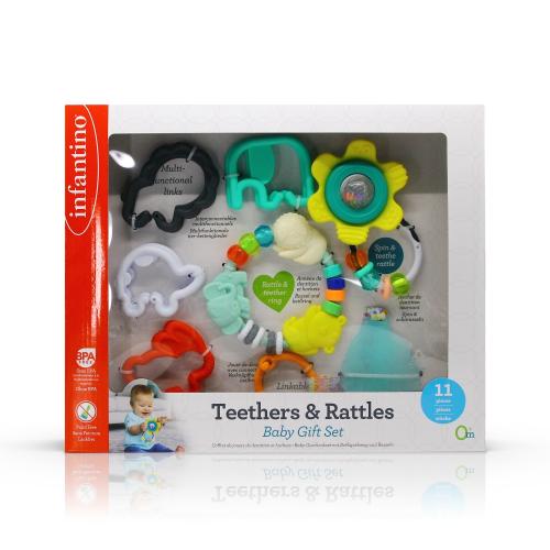 Бебетата ще се възхищат от този възхитителен подаръчен комплект, който включва въртяща се гризалка-дрънкалка, гризалка за закачане, пръстен с мъниста-дрънкалка и гризалка и 8 многофункционални звена с животни. Целият комплект е проектиран да бъде безопасен и ангажиращ за вашето мъниче и е напълно без BPA.