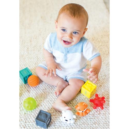 Моят първи комплект за игра е сладък комплект от 11 много гъвкави, лесни за хващане и дъвчене кубчета, топки, животни и превозни средства, изработени от пластмаса. Фигурките са с различни размери от 5-10 см. Подходящ за деца от 0 месеца.