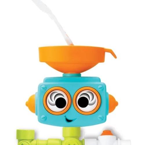 Направи си сам робот за баня! Налей вода във фунията на главата на робота и очите му ще се завъртят. Направете си сами път за водата, като отваряте и затваряте крановете. Децата ще се запознаят с причината и следствието. Роботът е от 16 части и може да бъде сглобен според собственото ви въображение. С 2 вендузи за сигурно закрепване.
