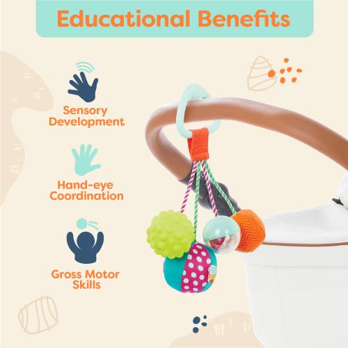 Забавлявайте се с тази дрънкалка Battat! Тя включва 4 различни топки, които малчуганите могат да изследват. Стиснете неравната топка, за да чуете забавни скърцания, разклатете прозрачната топка и гледайте как малките мъниста тракат вътре, смачквайте меката платнена топка и слушайте звънещата камбанка, скрита в меката топка. Освен че е изпълнена със забавление, тази мултисензорна играчка може също да събуди любопитството на бебето, да подобри координацията око-ръка и да развие фините му двигателни умения.