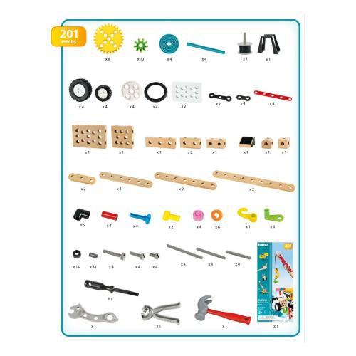 Серията BRIO Builder насърчава играта с отворен край, развива фината моторика, координацията око–ръка, логическото мислене и уменията за решаване на задачи. Изработен от висококачествени материали – европейска букова дървесина и здрава пластмаса – комплектът е подходящ за деца над 3 години и е еднакво подходящ както за момчета, така и за момичета. Управлението на конструкцията е лесно и интуитивно, а здравата конструкция издържа на интензивна игра. Включва строителни елементи, включително гайки, болтове, чук и отвертка, за да се създадат разнообразни модели.