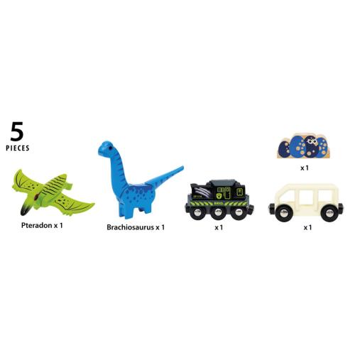 Детското влакче на батерии Brio, Динозавър предлага вълнуващо праисторическо приключение за малките любители на влакове и динозаври. Влакчето се движи напред и назад и има предна светлина, което прави играта по-реалистична и забавна. Включеното вагонче позволява преместване на динозаврите и техните яйца от място на място по железопътните релси. Комплектът включва два игриви динозавъра с цветен дизайн и уникални движещи се части, както и класически BRIO магнити за взаимодействие с други елементи от света на BRIO.