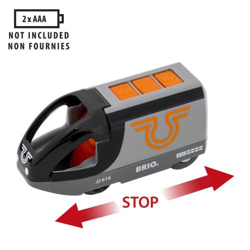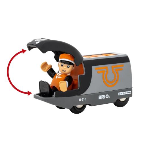 Детската играчка локомотив с батерии Brio позволява на децата да се потопят в интерактивни приключения из BRIO World. Влакчето е проектирано в черно и оранжево и се захранва от батерии, като лесните за използване бутони на покрива позволяват движение напред, назад и спиране с лекота. В предната част на влакчето има място за фигурка на машинист, което прави играта по-реалистична и забавна.