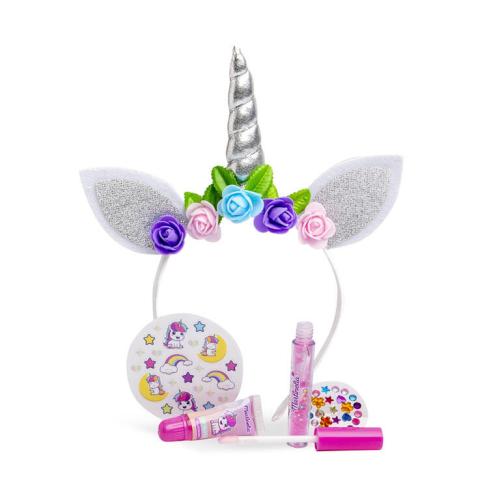 Този възхитителен комплект включва диадема с еднорог, два гланца за устни, бурканче с гланц за устни, стикери и стикери с кристали.