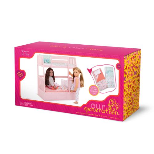 Удвоете забавлението преди лягане на вашата кукла с комплекта двуетажно легло на Our Generation! Това двуетажно легло за 46-сантиметрови кукли е идеално за близначки или най-добри приятелки кукли, които си правят преспиване. Кой ще е горното легло? Нека куклите ви се редуват! Тези двуетажни легла за кукли са проектирани в ярко розово, разполагат с вградена стълба за достигане до горното легло и са лесни за сглобяване. Просто щракнете частите заедно, сложете матраците и спалното бельо и ще сте готови да сложите куклите си в леглото за през нощта! Леглата включват 2 матрака от пяна, покрити с плат, 4 възглавници и 2 одеяла в прекрасни пастелни цветове със сладки шарки на пеперуди. Одеялата са и двуместни. Така че вашите кукли могат да се забавляват, докато преобзавеждат! Леглата „Dream Bunks“ са чудесно допълнение към всяка спалня за кукли и са чудесни и за пижами!
