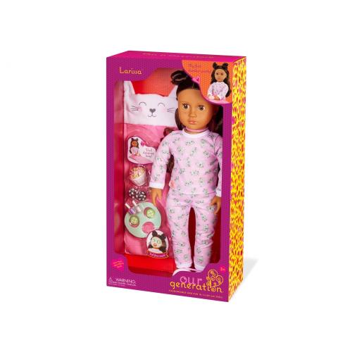 Мечтайте за пижамни партита и забавления в спа центъра с Лариса! Тази 46-сантиметрова кукла от Our Generation има меко тяло, което може да се прегърне, и реалистични черти, които ще зарадват феновете на куклите по време на игра. Вълнистата ѝ, тъмнокафява коса може да се оформя по много начини, а красивите ѝ кафяви очи наистина се затварят, когато е време за сладки сънища! Тя пристига облечена в пижама с котешка тематика и чифт пантофи. Освен това се предлага с бонус аксесоари, за да разигравате истории за преспиване. Комплектът включва спален чувал с котешка тематика, купа пуканки, 2 бисквитки, чаша шоколадово мляко, 2 бутилки изкуствен лак за нокти и маска за цялото лице с 2 резена краставица. Когато е време за обличане, тоалетът ѝ има лесно отварящи се закопчалки за бързо обличане и събличане. Така че можете да комбинирате, комбинирате и създавате по-стилни визии във всяко приключение! Куклите Our Generation са чудесен подарък за деца над 3 години (малки части), насърчавайки ги да си представят свои собствени уникални истории.
