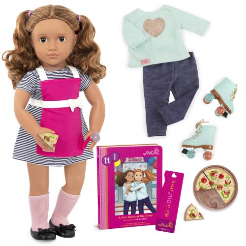 Забавлението е в менюто на закусвалнята с Иса, красива 46-сантиметрова кукла от Our Generation, с дълга, вълниста, светлокестенява коса и топлокафяви очи, които се отварят и затварят. Иса се предлага с 2 пълни тоалета! Нейният тоалет на сервитьорка включва раирана черно-бяла рокля, престилка и обувки, както и поднос с 6 парчета пица, които да сервира на гостите си. За различен външен вид, тя се предлага с тюркоазена тениска с дълъг ръкав и блестящ принт на сърце, сини дънкови панталони и чифт ролкови кънки! С книжката с приказки „Справедлив дял в закусвалнята“ прочетете за приключенията на Иса, която помага да изхрани общността си, като помага в кухнята за бедни. Тази лесна за четене книга е подходяща за по-малки читатели и е чудесна приказка за лека нощ. Главите ви позволяват лесно да правите паузи по време на четенето. Създайте свои собствени истории с тази вдъхновяваща колекция!