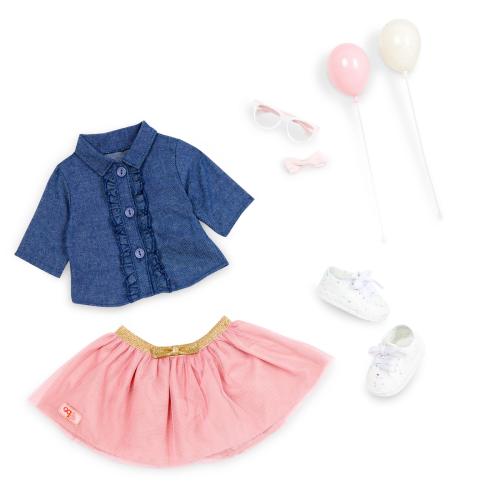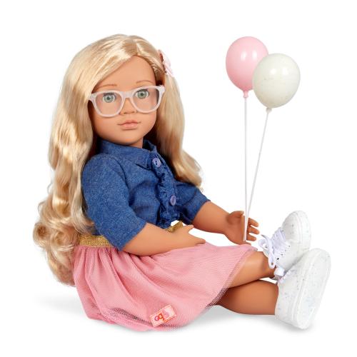 Планирайте рождени дни и изненадващи тържества с Емили! Тази кукла за планиране на партита от Our Generation, висока 46 см, има яркозелени очи, които се отварят и затварят, и дълга, вълниста руса коса, която може да се оформя. И е подвижна! Тя може лесно да сгъва коленете и лактите си, за да сменя лесно тоалетите си и да организира забавни партита с аксесоарите си - включително клипборд, контролен списък, уоки-токи, 2 балона и торта! Емили има меко и пухкаво тяло и пристига облечена в закопчан дънков топ с копчета, тюлена пола, очила и сладка панделка за коса.