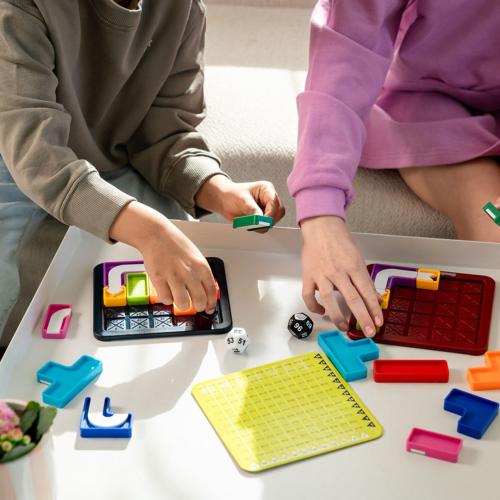 В комплекта са включени две игрални полета, които позволяват да се играе в дуел или всяко дете да работи върху собствена задача. Пъзел частите, заровете и картите с предизвикателства са компактни и лесни за подреждане, което прави играта практична за съхранение и подходяща за пътуване.