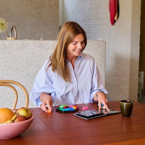 Комплектът включва шестоъгълна игрална дъска с капак, 12 меки пъзел части, книжка със 120 предизвикателства и решения, както и листовка с правилата на играта. Всички елементи са компактни и лесни за съхранение, което позволява използването на играта у дома или на път.