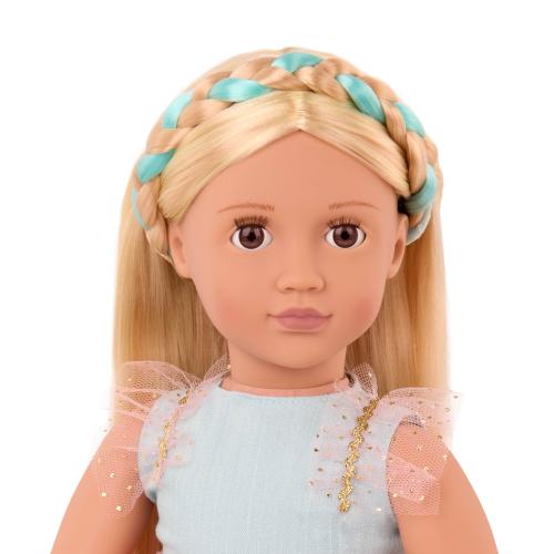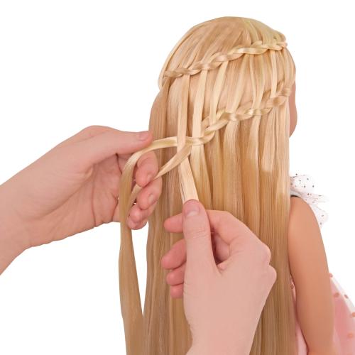 Дайте воля на въображението си с куклата Попи от Our Generation! Тази прекрасна 46-сантиметрова кукла има реалистични кафяви очи, които се отварят и затварят, и дълга (наистина дълга!) руса коса, която децата могат да оформят и украсяват с аксесоари! Куклите за растеж на коса от Our Generation имат разтегателни плитки, които могат да се правят по-дълги или по-къси с натискане на бутон. Освен това, тя се предлага с 2 цветни екстеншъна за коса и щипки за коса във формата на сърце, за да вдъхнете живот на вашата фризьорска креативност. Попи носи сладка рокля с розова волани, чорапи и ежедневни обувки. Срешете меката ѝ коса, за да я поддържа спретната и без заплитане. След това направете плитки, плитки и още сладки прически, които се вписват в въображението ви. Можете дори да използвате брошурата за стилизиране за вдъхновение, за да започнете! Колко прически можете да измислите за Попи? Тази кукла от Our Generation е прекрасен подарък за деца над 3 години (малки части), насърчавайки ги да създават свои собствени уникални истории и стилове.