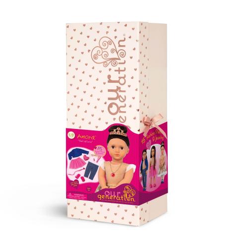 Създайте прекрасни стилове с Амора, 46-сантиметровата кукла от Our Generation, която обича цветната мода! Тя има красиви кафяви очи, които се отварят и затварят, а дългата ѝ кестенява коса е забавна за разресване, стилизиране и носене на аксесоари! Разопаковайте тоалетите на Амора и започнете да ги смесвате и съчетавате. След това я накарайте да заблести допълнително с искрящите аксесоари на тема сърце - включително колие с висулки, очила, имитация на лак за нокти и чанта във формата на сърце. Отваря се с цип, за да носите аксесоари в движение! Придайте на прическите на Амора нотка цвят с розовите удължители за коса. Или допълнете плитките, усукванията, прическите и опашките ѝ със златната тиара! Нуждаете се от малко вдъхновение? Отворете ръководството за стилизиране и открийте 3 сладки теми за стилизиране, включващи Небрежни, Парти страстни и Забавни и луксозни празненства! Тоалетите и бижутата имат лесно отварящи се закопчалки за бързо обличане и събличане, така че да можете да накарате Амора да покаже истинския си цвят във всяко приключение!