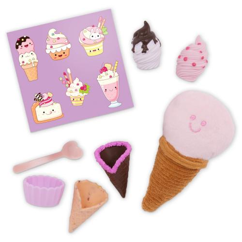 Сервирайте сладко забавление с Анди! Тази кукла от Our Generation, висока 46 см, има меко тяло, което може да се прегърне, и реалистични черти, които ще зарадват феновете на куклите по време на игра. Светлокафявите ѝ очи се отварят и затварят, а дългата ѝ, многоцветна коса е забавна за оформяне по много начини! Анди пристига в сладък тоалет на тема сладолед. Тя носи рокля с пола с цветовете на дъгата и качулка, блестящи чорапогащи, 2 ластичета за коса с помпони и ярко лилави обувки. Освен това, тя се предлага с бонус аксесоари като 2 вафлени фунийки, 2 спирали сладолед, купа, лъжица, лист с истински стикери и плюшена играчка сладолед за допълнително разказване на истории. Когато дойде време за обличане, тоалетът ѝ има лесно отварящи се закопчалки за бързо обличане и събличане. Така че можете да смесвате, съчетавате и създавате по-стилни визии за всяко приключение! Куклите от Our Generation са чудесен подарък за деца на възраст 3 и повече години (малки части), насърчавайки ги да си представят свои собствени уникални истории.