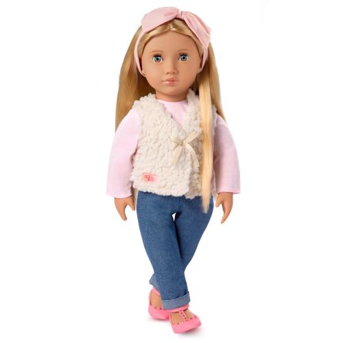 Вдъхновете приятелство и модно забавление с 46-сантиметровата кукла Еми от Our Generation! Тя носи стилен тоалет в сладки нюанси на синьо и розово, с жилетка от изкуствена кожа и лента за глава с панделка за допълнително обличане и игра с стилизиране. Еми има меко тяло, което може да се прегърне, и реалистични черти, които ще зарадват феновете на куклите по време на игра. Красивите ѝ сини очи се отварят и затварят, а дългата ѝ светлоруса коса е забавна за оформяне по много начини! За децата, които обичат да се обличат, тоалетът ѝ има лесно отварящи се закопчалки за бързо обличане и събличане. Така че те могат да смесват, съчетават и създават още повече стилове в нови приключения! Куклите от Our Generation са чудесен подарък за деца над 3 години (малки части), насърчавайки ги да си представят свои собствени уникални истории.