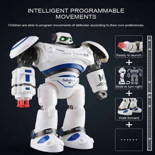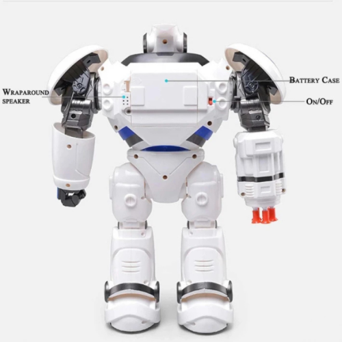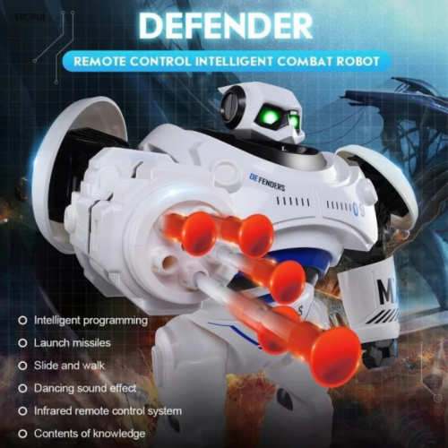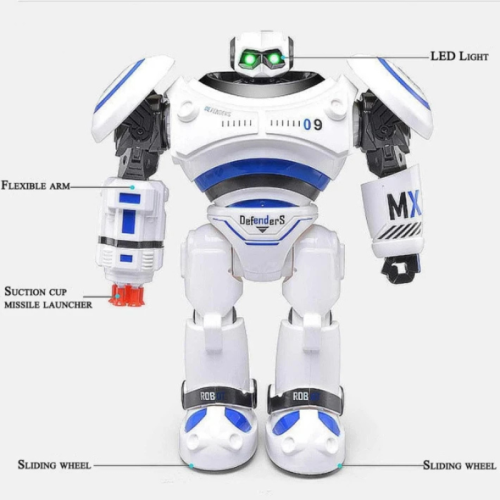 LED светлините, разположени в главата и тялото на робота, усилват усещането за футуристична атмосфера и правят играта още по-вълнуваща, особено в по-тъмни помещения. Системата за изстрелване на меки ракети с вакуумни накрайници добавя динамика, при това напълно безопасно, което носи усещане за приключенска и активна игра.
