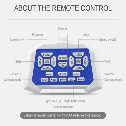 * Богато дистанционно с режими: демонстрация, бойни функции, стрелба, танци, регулиране на звук и скорост