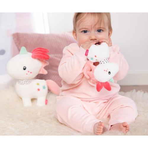 Меката дрънкалка еднорог babyFEHN Aiko & Yuki е очарователна играчка, създадена да стимулира сетивата и любопитството на най-малките. Със своя мек плюшен дизайн, цветни елементи и шумове от дрънкане и скърцане, тя приканва бебето към активна игра и изследване още от първите дни.