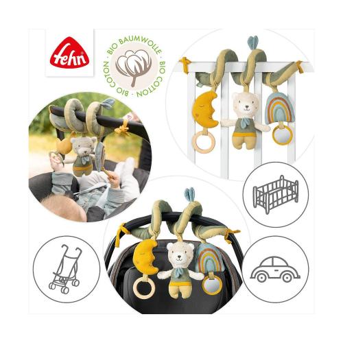 Бебешката активити спирала с мече babyFEHN, FehnNATUR е чудесен помощник за първите игри и откривателски моменти на бебето. Тя предлага разнообразни стимули — дрънкалка, пищялка, шумоляща хартия, огледалце и дървена халка, които развиват слуха, фината моторика и координацията око–ръка.