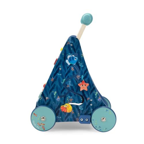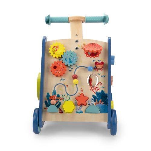 Открийте проходилката с активности от колекцията приключенията на Поли – прекрасна дървена играчка за прохождане, създадена за деца от 1 година. С нехлъзгаща се конструкция и дръжки с регулируема височина, тя осигурява стабилност и безопасност при първите стъпки на бебето. Облечена в цветовете на морските приключения на Paulie, тази проходилка кани детето да изследва подводния свят чрез 6 забавни и развиващи активности – лабиринт, зъбни колела, огледалце и още изненади. Идеалното съчетание между движение, игра и откриване!