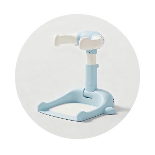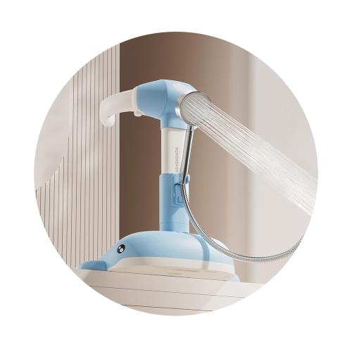• Стойката фиксира стабилно душа в удобна позиция, като освобождава и двете ръце за безопасно измиване и поддържане на детето.