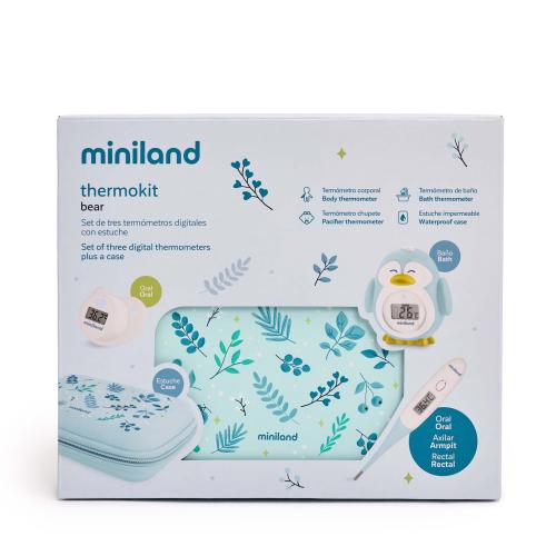 Комплектът Miniland Thermokit Squirrel е лесен за употреба комплект цифрови термометри, предназначени да отговорят на основните нужди за наблюдение на температурата на детето. Той включва три специфични термометъра: термометър за тяло с гъвкав връх, термометър с форма на биберон и термометър за вана и стая.