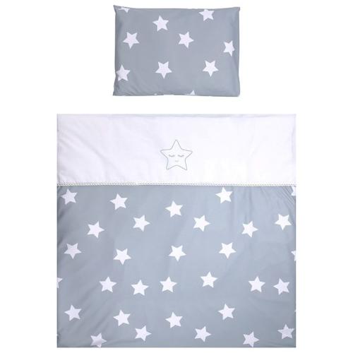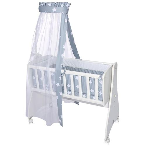 Комплектът включва: *Олекотена завивка: 75 х 75 cm *Плик за завивка с цип: 75 х 75 cm *Възглавница: 29 х 42 cm *Калъфка за възглавница: 42 х 29 cm *Долен чаршаф: 65 х 105 cm *Обиколник: 26 х 270 cm *Балдахин от тюл: 190 х 140 cm