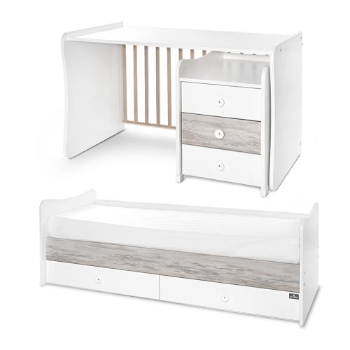 *Трансформация: Леглото позволява гъвкаво преустройство – когато детето порасне, се преобразува в юношеско легло с бюро. В случай на две деца, може да се оформи комбинация от бебешка кошарка с шкаф и отделно легло.