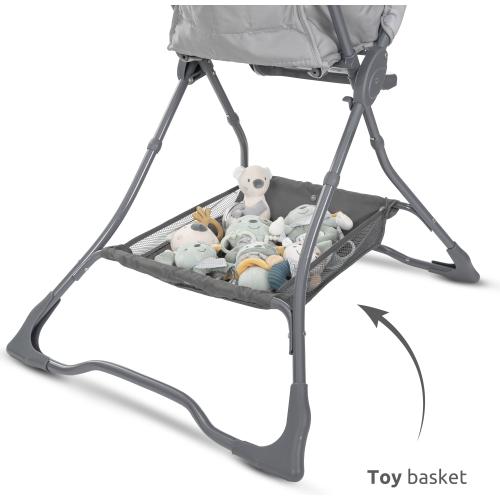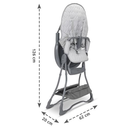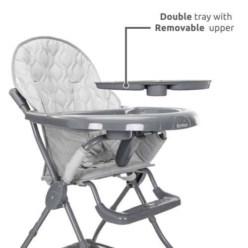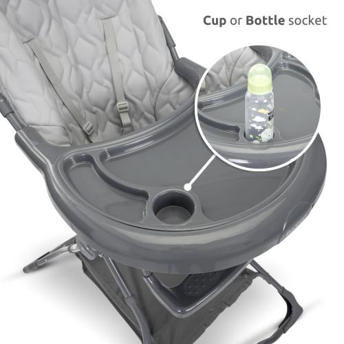 Столчето разполага с регулируема двойна табла, която е изключително практична – горната част може да се сваля и почиства лесно, като по този начин се осигурява хигиенична среда за хранене. Специалното място за чаша или шише прави храненето още по-удобно както за детето, така и за родителите. Включен е и кош за играчки или аксесоари, в който могат да се съхраняват всичко необходимо за хранене или игра.