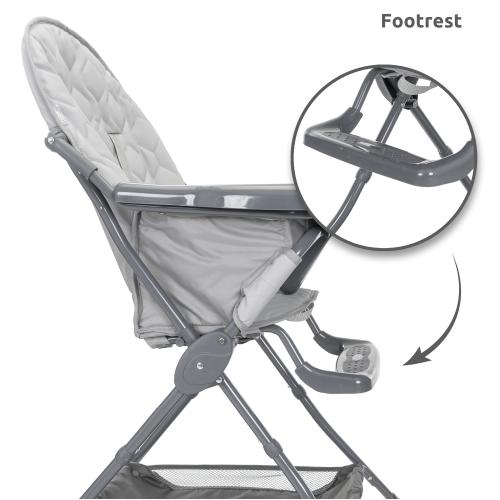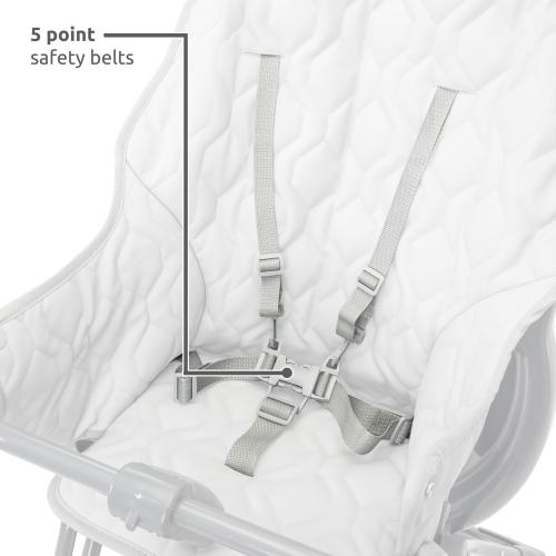 За безопасността на малчугана се грижат 5-точковите предпазни колани, които държат детето стабилно по време на хранене. Поставката за крачета осигурява допълнителен комфорт и правилна стойка на тялото, докато колелата позволяват лесно преместване на столчето в различни помещения.