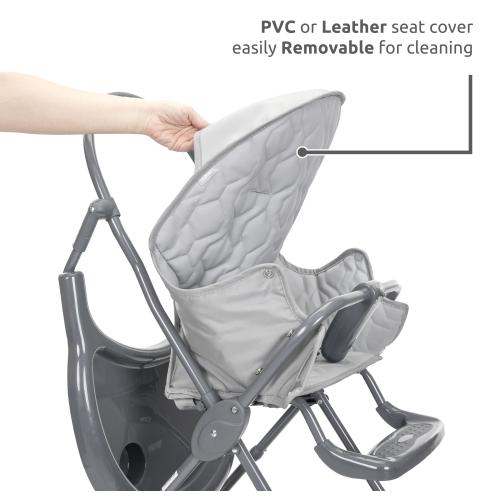 Lorelli Bonbon се сгъва бързо и компактно, така че не заема излишно място, когато не се използва. Калъфът е изработен от PVC и кожа, което прави почистването му лесно и удобно – само с едно забърсване столчето е отново готово за употреба.