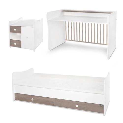 Допълнително удобство представляват двете големи чекмеджета под леглото и многофункционалният шкаф с чекмеджета, които могат да съберат голямо количество дрехи и аксесоари. Плотът за повиване, който може да бъде монтиран отляво или отдясно, осигурява комфорт и практичност при ежедневните грижи за бебето и позволява извършване на масажи през първите месеци.