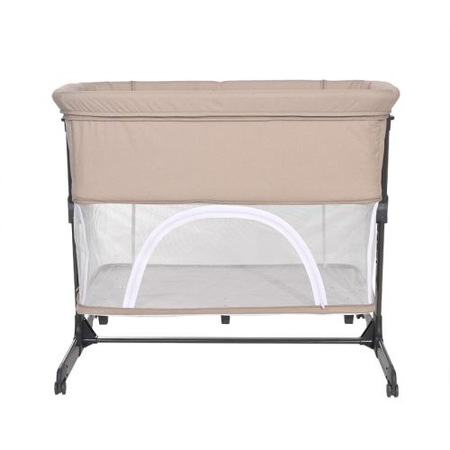 Алуминиевата рамка е олекотена, което прави кошарата лесна за преместване. Подвижната страна с мрежеста част осигурява добра вентилация и видимост към бебето, а страничната преграда с цип позволява кошарата да бъде доближена до леглото на родителя, за да се улесни през нощта.