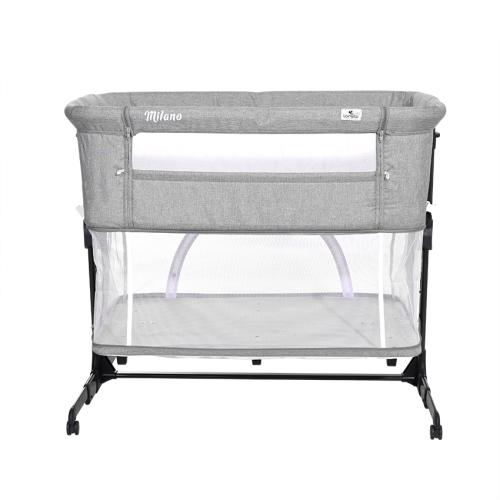 Алуминиевата рамка е олекотена, което прави кошарата лесна за преместване. Подвижната страна с мрежеста част осигурява добра вентилация и видимост към бебето, а страничната преграда с цип позволява кошарата да бъде доближена до леглото на родителя, за да се улесни през нощта.