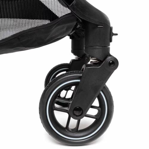 Вашето малко съкровище ще се наслаждава на най-удобните разходки в тапицираното и просторно седалка на Eva³. Големият капак е проветрив и блокира ултравиолетовите лъчи, като осигурява не само комфорт, но и защита от слънцето. Независимо дали сте в града или по неравен терен, 4-колесната окачване на количката гарантира, че детето ви ще се наслаждава на гладка разходка при всяка излизане.