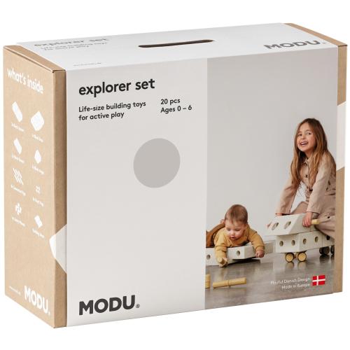 Игралният комплект Modu Explorer set е многофункционална играчка за упражняване на основни двигателни умения на вашия малчуган. Този комплект от следващо ниво предлага най-малко 15 различни творения за изграждане и много повече за креативно мислещите. Усъвършенствайте двигателните умения на децата си чрез игра с множество възможности. Изработен е от 100% рециклируема EPP пяна и хранителен ABS. За почистване просто избършете с влажна кърпа, като може да се почиства и в съдомиялна машина. Комплектът е подходящ за деца 0 до 6 годинки (с максимално тегло до 50 kg) и останалата част от семейството.