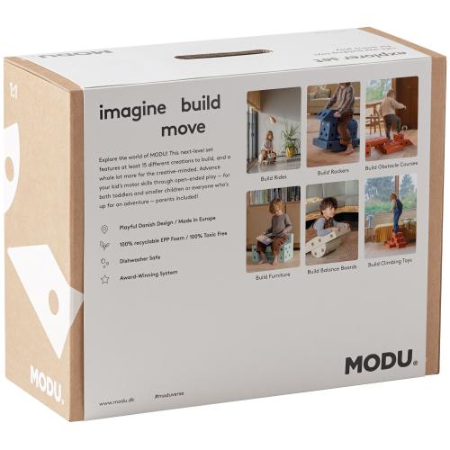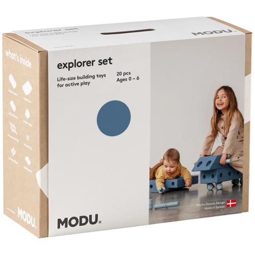 Игралният комплект Modu Explorer set е многофункционална играчка за упражняване на основни двигателни умения на вашия малчуган. Този комплект от следващо ниво предлага най-малко 15 различни творения за изграждане и много повече за креативно мислещите. Усъвършенствайте двигателните умения на децата си чрез игра с множество възможности. Изработен е от 100% рециклируема EPP пяна и хранителен ABS. За почистване просто избършете с влажна кърпа, като може да се почиства и в съдомиялна машина. Комплектът е подходящ за деца 0 до 6 годинки (с максимално тегло до 50 kg) и останалата част от семейството.