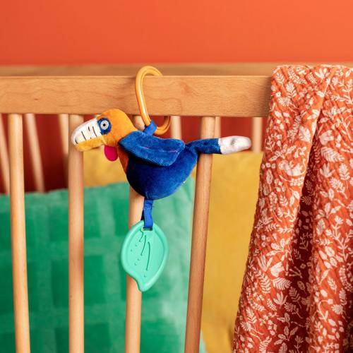 Запознайте се с цветния тукан с активности от колекцията горатa Мава на Moulin Roty – мека играчка за окачване, създадена да забавлява и стимулира сетивата на бебето още от първите му месеци. Ярките цветове и интерактивните елементи приканват към докосване, разклащане и изследване. В коремчето си той крие дрънкалка, а шумолящите крилца  добавят още забавление и сетивни открития. Към играчката е прикрепена и гризалка във формата на листа, която помага за облекчаване на дискомфорта при никнене на зъбките. Тукана с активности лесно се закача за количка, активна гимнастика или кошара и ще бъде верен спътник на бебето в ежедневните игри у дома и навън.