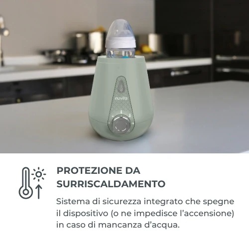Благодарение на системата за защита от прегряване, която изключва устройството (или предотвратява включването му) в случай на ниски нива на водата, електрическият затоплящ уред за бутилки Nuvita е безопасен както у дома, така и в колата.