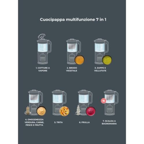 Оборудван е със 7 интегрирани функции за готвене на пара на зеленчуци, бобови растения, месо и риба, пасиране и нарязване, смилане, приготвяне на зеленчуков бульон, пюрета, супи, плодови смутита и бебешка храна. Може да се използва и за затопляне на храна на водна баня.
