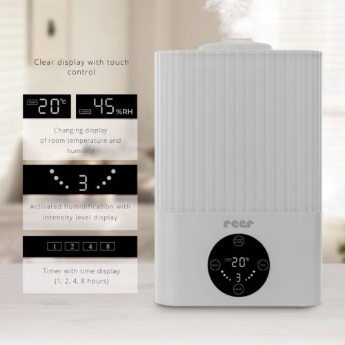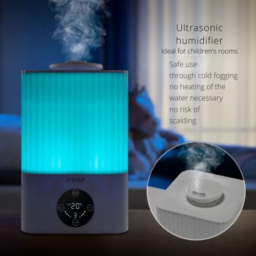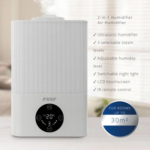 Овлажнителят 2 в 1 е предназначен за помещения до 30 м². Той ефективно поддържа оптимални нива на влажност в повечето детски стаи, намалявайки риска от развитие на акари, бактерии и мухъл. По този начин гарантира идеалната среда за игра и сън на вашето дете. За да се предотврати изгаряне от гореща вода или пара, водата се пулверизира в хладна мъгла с помощта на ултразвукова технология.