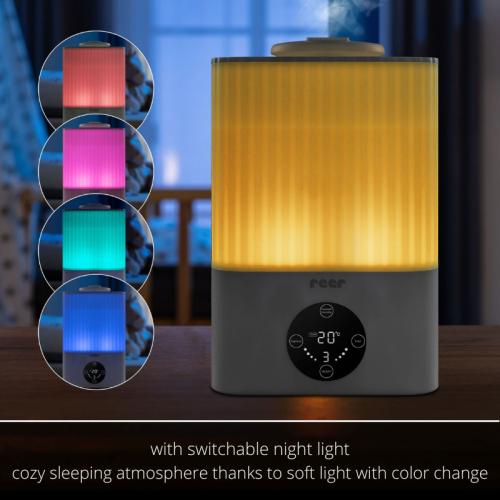 Овлажнителят разполага с вградена нощна светлина, която създава уютна атмосфера в детската стая, като нежно насочва детето към приспиване. Светлината плавно преминава между различни цветове, от успокояващо синьо до топло жълто, нежно насочвайки детето ви към сън. Мекото осветление придава позната атмосфера на иначе тъмната стая, дори през нощта, и улеснява детето ви да заспи бързо след периоди на будност. Лесен за употреба