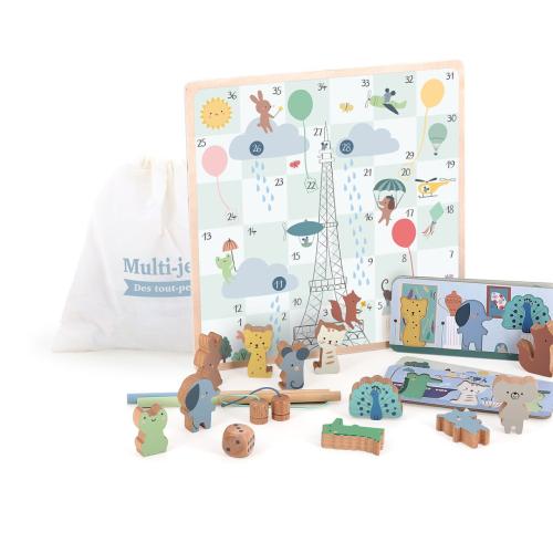 Дървеният комплект от 4 игри за най-малките Vilac, Sarah Betz предлага забавление и обучение в едно, подходящо за деца от 2-годишна възраст. Илюстриран от Сара Бец, комплектът включва симпатични малки животни, които могат да се използват във всичките 4 игри – класическата игра на гъска, змии и стълби, риболов и лото. Всяка игра е проектирана да стимулира фините двигателни умения, логическото мислене и координацията ръка-око, като същевременно предлага възможност за споделяне на весели семейни моменти.